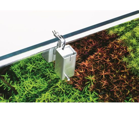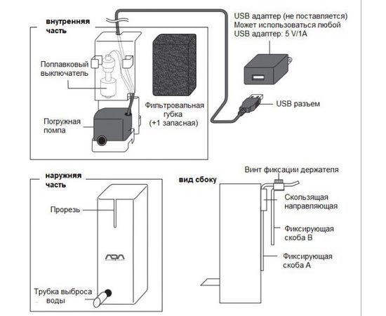 Обновленная версия VUPPA I. Поверхностный экстрактор, изготовленный их нержавеющей стали в элегантном дизайне кубической формы обладает некоторыми преимуществами по сравнению с предыдущей версии этого устройства: он легко справляется с удалением пленки и прочих плавающих частиц (фрагменты листьев и стеблей растений, и т.д.) и при этом имеет максимально упрощенное устройство камер, облегчающих уход и обслуживание VUPPA II. Другим усовершенствованием VUPPA II является встроенный в корпус регулировочный поплавок, управляющий работой помпы. Ваша VUPPA больше не подвержена риску завоздушивания микропомпы вследствие снижения уровня воды в аквариуме - система контроля просто отключит помпу. VUPPA II может использоваться в аквариумах разных объемов и габаритов. Это продукт польностью готовый и собранный. Для начала эксплуатации просто установите VUPPA II на стекле аквариума и наслаждайтесь кристальной чистотой поверхности воды без жирных пленок и плавающей грязи. Установка VUPPA II в аквариуме (VUPPA II может быть установлена на любом аквариуме с безрамной конструкцией с толщиной стекло до 15 мм) • Ослабьте винт фиксации и сдвиньте от корпуса VUPPA II фиксирующую скобу B. Соблюдайте осторожность - избегайте контакта фиксирующей скобы А со стеклом аквариума. • Повесьте VUPPA II на стекло аквариума и с помощью фиксирующей скобы B закрепите ее с учетом тощины стекла аквариума. • Зафиксируйте скобы А и В одной рукой, и с помощью небольшой отвертки затяните фиксирующий винт. • Перемещая VUPPA II по скользящей направляющей вверх-вниз добейтесь такого положения устройства, чтобы верхний край VUPPA II находился на уровне поверхности воды. • Убедитесь в том, что VUPPA II находится в воде и покллючите USB разъем к соответствующему USB адаптеру. Включите устройство. Не допускайте работы погружной помпы на воздухе - это может привести к ее поломке. Вследствие испарения воды, а также при проведении водоподмены уровень воды в аквариуме может снижаться и подниматься. Данный продукт может самонастраиваться в пределах колебания уровня воды максимум 3 см. Поэтому при таком колебании нет необходимости в изменении положения VUPPA II. Однако если уровень воды снизился больше чем на 3 см, и объем попадающей в устройство воды становится меньше, VUPPA II теряет свою эффективность по удалению маслянистой пленки на поверхности воды. Если урвоень воды оказался ниже прорези на корпусе VUPPA II, либо долейте в аквариум воды, либо измените положение VUPPA II. Устройство может издавать слабые щелчки, свидетельствующие об активации работы погружной помпы. Щелчки издаются поплавковым выключателем - это нормально. Корм для рыб, плавающий на поверхности, может засасываться в устройство через щель на корпусе. Немедленно удаляйте любые объекты, оказавшиеся на прорези и мешающие свободному току воды. Мелкая аквариумная фауна может засасываться устройством. Если это происходит часто, используйте VUPPA II только тогда, когда это необходимо - в зависимости от условий в аквариуме. ADA не несет никакйо ответственности за повреждения и гибель каких бы то ни было животных и рыб в результате эксплуатации VUPPA II.