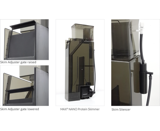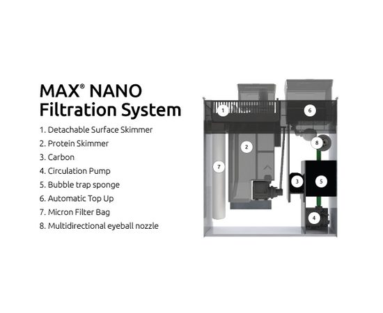 Макс® нано Флотатор Сердце системы фильтрации - это флотатор. Нано скиммер сделан для аквариума с кораллами SPS, передавая весь объем аквариумной воды через скиммер примерно 3 раза в час и с 3 до 1 соотношение воды в воздухе. Скиммер нано не зависит от колебаний уровня воды в сампе за счет испарения и имеет регулируемый выход строба для поддержания оптимальной консистенции skimmate, которая будет варьироваться в зависимости от фактического состояния воды. Скиммер нано работает тихо со встроенным глушителем впуска воздуха и оснащен губкой на выходе, чтобы устранить звук струящейся воды. Заднего поддона включает в себя фиксированный полка для СМИ, возможности гарантировать 100% положительный поток воды. На макс® нано поставляется с 100 г Красного моря, РИФ-спецификаций® углерода, который будет держать аквариумную воду кристально чистой в течение первых 2 месяцев работы. Автоматический Топ-Офф На макс® нано включает в себя Автоматический Топ-блок с 1,5 л/ 4 галлонов пресной воды, которая скрыта за ширмой над отстойником. Конструкция задней отстойник вместе с автоматической верхнее водохранилище делает Макс® нано самодостаточной в течение 3 дней. Максимум Автоматическая початочек нано Блок управления для скиммера и циркуляционные насосы Макс® Nano оснащен силовой центр с индивидуальными переключатели вкл/выкл для скиммера и циркуляционных насосов позволяет легкий доступ для кормления и обслуживания.