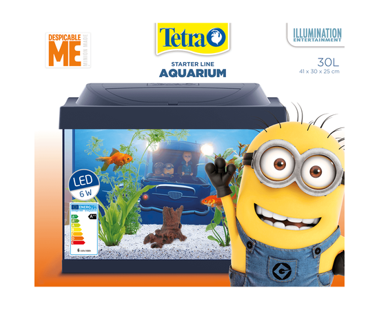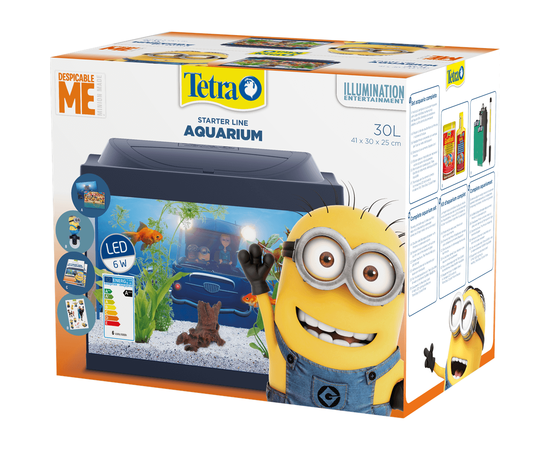 С аквариумом Тетра «Гадкий я» все поклонники миньонов смогут легко и уверенно начать изучать мир аквариумистики. В комплект входит базовое оборудование, а также корм и средства по уходу, необходимые на начальном этапе, и, кроме того, полезные инструкции по установке и декорации с изображением миньонов.