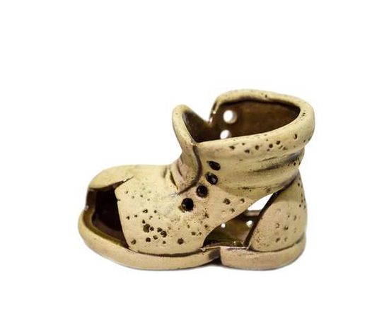 Башмак сделан из терракотовой глины, это означает что декорация не меняет состав воды и безвредна для рыб. В нем есть отверстия для укрытия и нереста рыбы. Размер 7,5 в длину, 5 ширину и 6 в высоту. Для тонирования декорации используют специальную глазурь. Он тонет в воде , не требует фиксации, подходит для пресноводных и морских аквариумов. Этот декор сделан вручную, поэтому могут незначительно отличаться друг от друга. Для использования ополосните под водой. Отлично чистится механическим способом. Сделано в Орловской области, сама глина добыта из центральной части России.