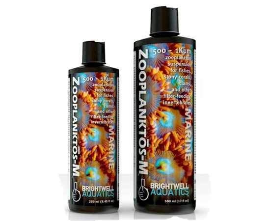 Brightwell Aquatics Zooplanktōs– концентрированная обогащенная фитопланктоном суспензия взрослой коловратки Brachionus sp., ее яиц, яиц других групп ракообразных, вследствие чего этот продукт является источником питания, богатого содержанием аминокислот, жирных кислот, включая полиненасыщенные кислоты Омега-3, витаминов, минералов и пигментов (каротиноиды), придающих смеси натуральный ярко-желтый цвет. Все перечисленные кормовые компоненты по своему размеру попадают в два класса: микропланктона (20.0 - 200.0 мкм) и мезопланктона (200,0 – 2000,0 мкм). Это оптимальный размер для кормления многих видов жестких кораллов (в частности, тех из них, которые имеют короткие щупальца), равно как и моллюсков и прочих двустворчатых, губок, оболочников (асцидий), перистых червей (червей Рождественское дерево, веерных червей и др.), личинок беспозвоночных, таких как большинство членистоногих и двустворчатых, молоди рыбы, взрослой рыбы, питающейся планктоном (антиасы, граммы, псевдохромисы, хромисы, немателеотрисы и т.д.), рыбы, охотящейся на микробеспозвоночных (мандаринки, некоторые бычки, губаны и т.д.).