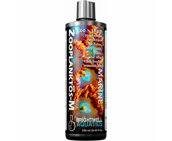 Brightwell Aquatics Zooplanktōs– концентрированная обогащенная фитопланктоном суспензия взрослой коловратки Brachionus sp., ее яиц, яиц других групп ракообразных, вследствие чего этот продукт является источником питания, богатого содержанием аминокислот, жирных кислот, включая полиненасыщенные кислоты Омега-3, витаминов, минералов и пигментов (каротиноиды), придающих смеси натуральный ярко-желтый цвет. Все перечисленные кормовые компоненты по своему размеру попадают в два класса: микропланктона (20.0 - 200.0 мкм) и мезопланктона (200,0 – 2000,0 мкм). Это оптимальный размер для кормления многих видов жестких кораллов (в частности, тех из них, которые имеют короткие щупальца), равно как и моллюсков и прочих двустворчатых, губок, оболочников (асцидий), перистых червей (червей Рождественское дерево, веерных червей и др.), личинок беспозвоночных, таких как большинство членистоногих и двустворчатых, молоди рыбы, взрослой рыбы, питающейся планктоном (антиасы, граммы, псевдохромисы, хромисы, немателеотрисы и т.д.), рыбы, охотящейся на микробеспозвоночных (мандаринки, некоторые бычки, губаны и т.д.).