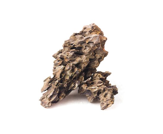 Главное преимущество этого камня – его внешний вид. Все отверстия на поверхности ориентированны в одну сторону, так как созданы самой природой при помощи воды под воздействием приливов и отливов. Визуально Камень «Дракон» напоминает скалу, покрытую чешуей дракона. Обычно он имеет зеленовато-коричневый оттенок и более легкий вес по сравнению с другими камнями, применяемыми для акваскейпа.