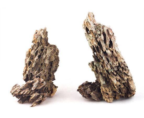 Главное преимущество этого камня – его внешний вид. Все отверстия на поверхности ориентированны в одну сторону, так как созданы самой природой при помощи воды под воздействием приливов и отливов. Визуально Камень «Дракон» напоминает скалу, покрытую чешуей дракона. Обычно он имеет зеленовато-коричневый оттенок и более легкий вес по сравнению с другими камнями, применяемыми для акваскейпа.