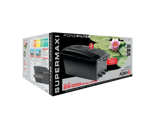 Вода в пруду подвержена не только механическому загрязнению, но и биологическому. Последнее возникает вследствие жизнедеятельности рыб. Естественные выделения рыб отравляют воду и, накапливаясь, ставят под угрозу жизнь самих рыб и растений. Чтобы вода в пруду оставалась чистой, необходимо установить фильтр, который справится и с таким видом загрязнения. Существует два вида прудовых фильтров. Первый вид – внешние - устанавливающиеся на берегу водоёма. Второй вид – подводные - монтирующиеся на дно. Внешние фильтры экономят место в пруду, но их не всегда можно спрятать или красиво замаскировать. Подводного же оборудования не будет видно, но оно займёт лишнее место в самом пруду. Кроме того, обслуживание подводных фильтров более трудоёмко, нежели обслуживание внешних.«AQUAEL» предлагает фильтр SUPERMAXI рассчитанный на пруд объемом 25куб.метров.Это универсальное оборудование, которое можно устанавливать как на берегу, так на дне пруда. Фильтр представляет собой пластиковый короб, наполненный фильтрационными вкладышами (щётки, два слоя губки, кокосовое волокно, биошарики). К входному отверстию присоединяется шланг насоса, через выходное отверстие очищенная вода попадает в пруд. Работает совместно с насосами AQUAJET PFN 7500/10000. Обеспечивает механическую и биологическую очистку. Рассчитан на непрерывную рaботу.
