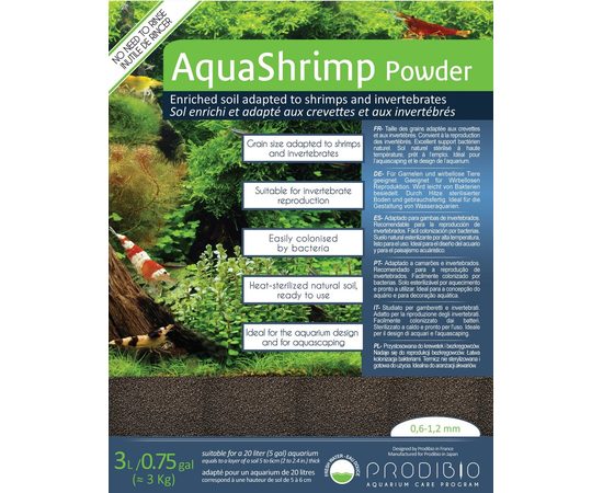 Разработан для креветок и беспозвоночных. Легко заселяется бактериями. Стерилизованный высокой температурой и полностью готовый к использованию Идеален для устройства дизайна и рельефа аквариума. Объем пакета 3 л, т.е. рассчитан на аквариум 20 л. Производитель - PRODIBIO. Фракция мелкая 0,6-1,2 мм. Предназначен для содержания и разведения креветок и беспозвоночных. Покупайте новинку 2017 года. на нашем сайте аквамагаз AquaShrimp Powder .