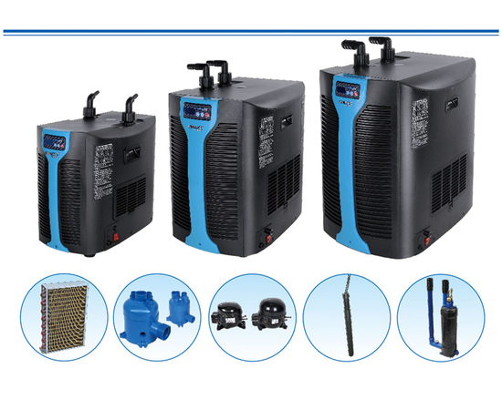 У модели 1/6HP Охлаждения объем воды: 100 - 250 л/час Циркуляции воды Объем: 600 ~ 2000 л/час Размеры: 472x330x450 мм Размеры упаковки: 540x385x535 мм Вес: 19 кг