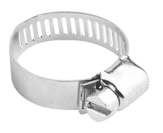 Хомут с винтовым зажимом под крест и шлиц. Края завальцованы во избежание повреждения поверхностей шлангов.  Затягивание шестигранной головки хомута — при помощи отвертки или ключа.