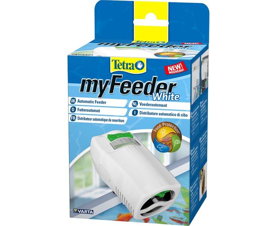 Кормушка автоматическая Tetra myFeeder белая - новинка 2017 года. В ней возможно установить до 3 кормлений в день при этом настроить дозировку количества корма при кормлении. Дополнительно есть возможность покормить при помощи нажатия кнопки. Эта кормушка рассчитана для большинства типов корма. Вся информация отображается на цифровом дисплее.Можно смонтировать на различные типы аквариумов, с крышками и без. Уникальная технология тройной защиты (Защита от света; Защита от влаги; Защита от воздуха). Включает батарейки Varta.