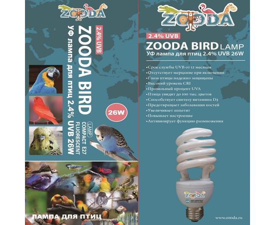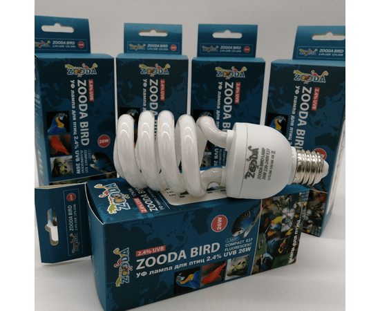Специализированная ультрафиолетовая лампа ZOODA BIRD COMPACT E27 для освещения всех видов птиц и попугаев. Разработана ведущими немецкими специалистами, с проведением испытаний под контролем признанных орнитологов Великобритании и Испании.