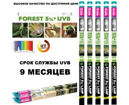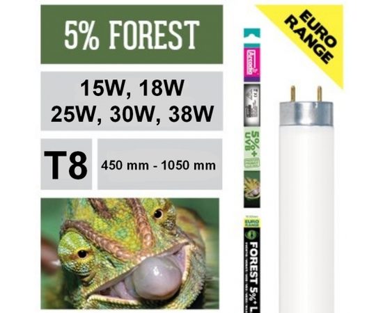 Ультрафиолетовые люминесцентные лампы серии EURO RANGE FOREST предназначены для животных, обитающих в лесах. Ультрафиолет необходим рептилиям для усвоения организмом кальция, недостаток которого ведет к развитию такого заболевания как рахит. Световой спектр и доля ультрафиолетового излучения этих ламп соответствуют естественным, которые животные получают в природе.