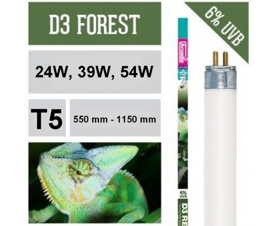 Люминесцентные лампы для рептилий, изготовленные по технологии Т5, с уровнем ультрафиолета 6% для правильного синтеза витамина D3. Большое увеличение видимого света и УФ излучения, по сравнению с лампами Т8 аналогичной длины. Подходят для всех лесных и водных видов рептилий. Лампа также содержит 30% UVA. Производит отличные естественные цвета.
