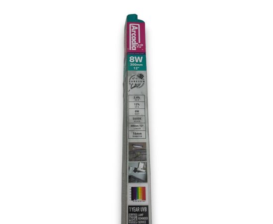 В отличие от обычных люминесцентных ламп, Arcadia Bird Lamp использует специальные УФ-излучающие люминофоры для воспроизведения спектральной картины солнечного света с UVA 12% (общего светового потока) и 2,4% UVB.