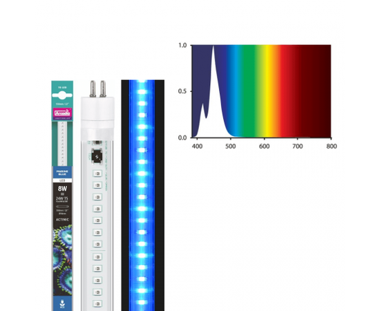 Лампы обладают спектральными пиками 420 нм и 450 нм - это актиничные пики для естественной флуоресценции кораллов. Синий свет в лампах LED Т5 TUBES Marine Blue проникает глубоко на дно аквариума и является полезным для всех живых кораллов.