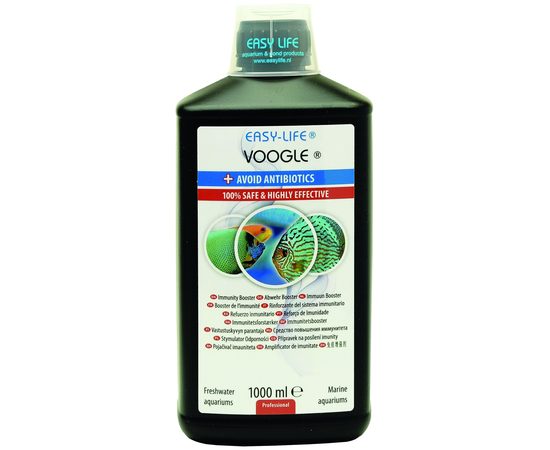 Easy Life Voogle - это идеальный уход за рыбами, который снизит применение антибиотиков. Средство увеличивает сопротивляемость и поддерживает естественные процесс заживления механических повреждений. Не имеет проблем с резистентностью. Регулярное применение Easy Life Voogle помогает защитить рыб в сложных стрессовых ситуациях, такие как транспортировка, загрязненная вода, увеличение патогенной флоры. Препарат помогает защитить наиболее уязвимые органы рыб: слизистая оболочка, жабры, плавники от грибков, белых пятен и других видов инфекций. С Voogle рыба будет максимально защищена от болезнетворных микроорганизмов. Easy Life Voogle: состоит из растительных экстрактов, содержащих витамины и минералы не влияет на важные параметры воды и не вызывает сопротивления нет необходимости менять воду после использования, т.к. препарат естественно расщепляется. не оказывает вредного воздействия на рыбу, креветок, лобстеров, моллюсков, растения или биофильтр Рекомендации по применению Easy Life Voogle: Для лечение больных рыб предусматривается 5-дневный курс лечения - 10 мл на 40 литров. Профилактика заболеваний 10 мл на 100 литров воды в аквариуме один раз в неделю. При транспортировке 10 мл на 40 литров. Карантин (импорт рыбы)5-дневный курс лечения, 10 мл на 40 литров Новая рыба в аквариуме - 10 мл на 40 литров аквариумной воды на 3 дня Упаковка: 100 мл - 250 мл - 500 мл - 1000 мл - 5000 мл