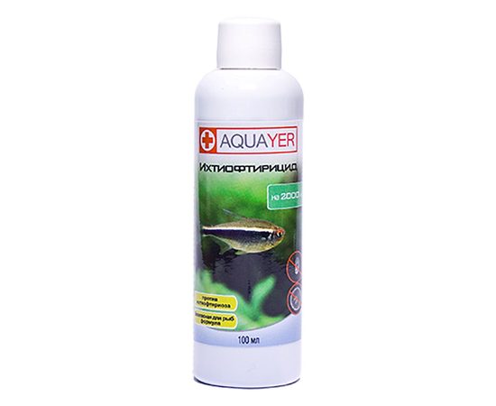 AQUAYER Ихтиофтирицид - эффективное средство против многих форм Ichthyophthirius (ихтиофтириоз, ихтик, манка) в аквариумах с пресной и морской водой. Не содержит ядовитый для рыб формалин (формальдегид). В состав входят безопасный и эффективный альдегид - заменитель формальдегида, малахитовый зеленый. Какие преимущества препарата AQUAYER Ихтиофтирицид? Большинство отечественных и импортных препаратов против ихтиофтириоза содержат формальдегид (формалин) как один из компонентов-антисептиков. Он помогает избавиться от внешних паразитов, но в тоже время является крайне токсичным для аквариумных рыб. Зачастую такая обработка аквариума приводит к гибели рыб, особенно при завышенных дозировках. Но, не смотря на это, многие производители не отказываются использовать формальдегида (формалин) ввиду его низкой цены. AQUAYER Ихтиофтирицид не содержит формальдегид. Вместо него в наших препаратах используется более эффективный антисептик, безопасный для рыб альдегид – заменитель формальдегида. Поэтому используя AQUAYER Ихтиофтирицид, Вы уменьшаете вероятность отравления рыб до минимума даже при завышенных дозировках. Новая версия AQUAYER Ихтиофтирицид стала в четыре раза более концентрированной, поэтому теперь AQUAYER Ихтиофтирицид значительно экономичней аналогов других производителей. 100 мл препарата достаточно для обработки 2000 л воды.