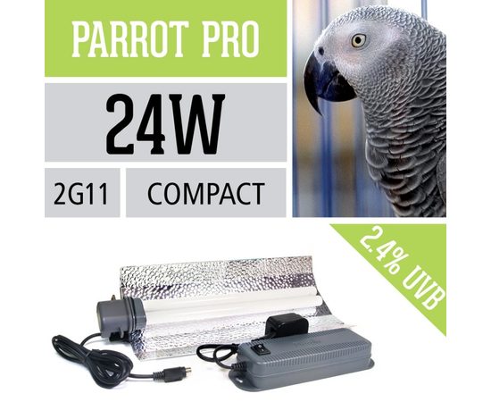 Фирменный светильник Parrot Pro для создания UVA и UVB спектра, который так необходим для птиц, содержащихся в неволе. Parrot Pro UV Flood освещает более широкую область клетки, чем любая другая лампа или светильник. Наличие электронного балласта медленно разжигает лампу, что хорошо сказывается на зрении птицы. В комплект входит лампа Bird Compact 2G11 24 Вт 2,4 % UVB. Дополнительно, возможна установка светильника на мобильный стенд Parrot Pro Stand. Стенд не входит в комплект светильника и приобретается отдельно!