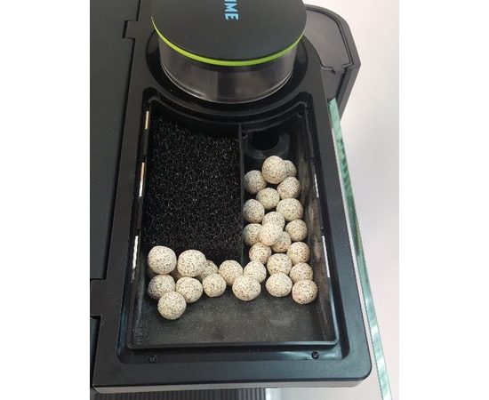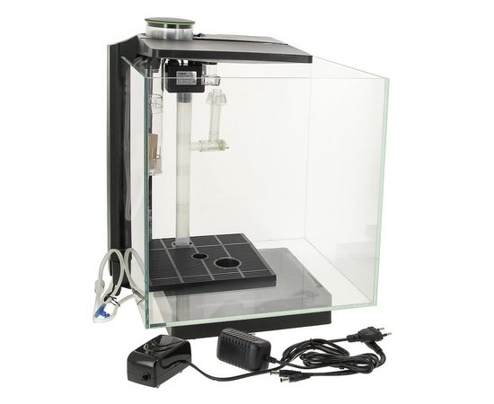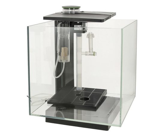 Аквариум оснащен уникальной системой фильтрации: вода забирается через донный фильтр. Таким образом, наполнителем фильтра становится весь слой донного грунта, в котором происходят процессы нитрификации и окисления продуктов жизнедеятельности обитателей аквариума. Дальше вода попадает в отсек перелива, который заполнен керамическими пористыми шариками и губкой. Вместо керамики в этот отсек можно положить адсорбенты: активированный уголь или антифос.