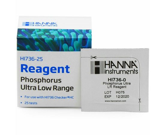 Эти реагенты следуют методу аскорбиновой кислоты, в котором реакция между фосфором и реагентами вызывает синий оттенок в образце. Путем просто добавлять пакет реагента HI736-25 к образцу, реакция осуществит и HI736 определит концентрацию от цвета который произведен. Результаты будут показаны в ppb фосфора. Эти реагенты предназначены для использования с образцами, которые имеют ожидаемый диапазон от 0 до 200 ppb фосфора.
