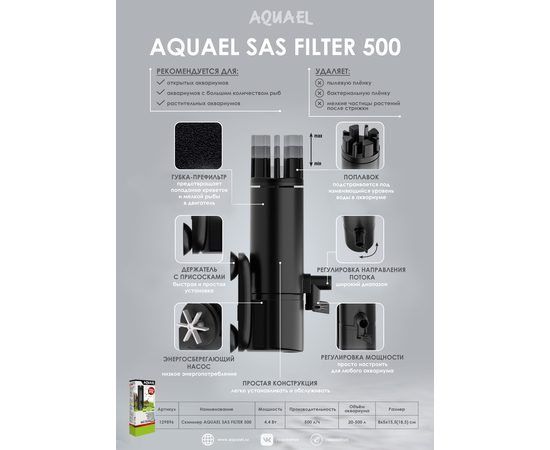 SAS FILTER 500 - фильтр, предназначенный для пресноводного аквариума для удаления с поверхности воды слоя загрязнений, появляющегося в результате оседания пыли, образования бактериальной пленки или при всплытии мелких растительных остатков. Помогает сохранять эстетически привлекательный вид аквариума (особенно открытого), поддерживает процесс фильтрации и аэрации воды.