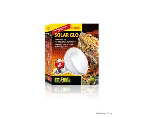 Solar Glo Лампа солнечного света • Оптимальное сочетание ультрафиолетового, инфракрасного и видимого света • Газоразрядная ртутная лампа со встроенным балластом • Обеспечивает все преимущества натурального солнечного света • Помогает предотвратить заболевания костей, вызываемые нарушением метаболизма • Увеличенная зона распространения ультрафиолета (+30 см) Светильники Exo Terra Glow Light (PT-2056) или Exo Terra Wire Light великолепно подходят для ламп Solar Glo.