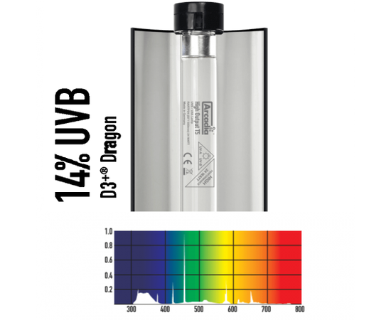 Светильник ARCADIA PRO T5 UVB KIT Dragon 14% UVB "маленький, но могучий". Это достигается благодаря специальному рефлектору, который входит в набор. Рефлектор очень удобен в эксплуатации, легко снимается, для очистки, и имеет 2 угла отражения от каждой кривой.