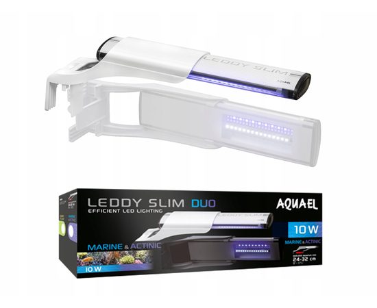 Специально для небольших морских аквариумов подготовлена светильник LEDDY SLIM DUO MARINE и ACTINIC. Так же, как и версия пресноводную содержит два ряда светодиодов, мощностью 10 Вт. Половину составляют светодиоды MARINE, излучающие мощный, белый свет с цветовой температурой 10000 K, обеспечивающие хороший рост кораллов. Остальные светодиоды ACTINIC излучают синий свет aktyniczne, которая усиливает оттенок морских животных.