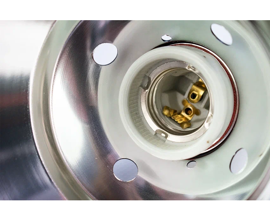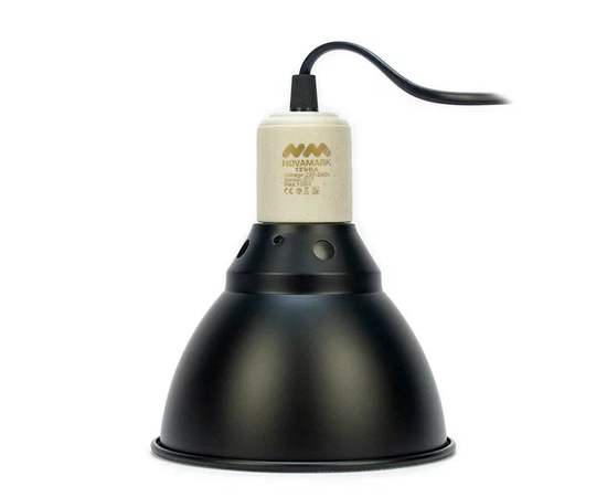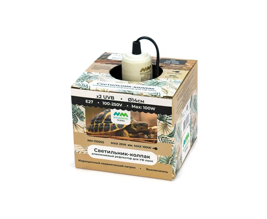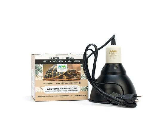 Светильник-колпак NOVAMARK TERRA изготовлен из полированного алюминия. Оснащен глубоким, металлическим, куполообразным рефлектором, увеличивающим поток ультрафиолетовых лучей до 100%. Глубина светильника полностью скрывает ультрафиолетовые компакт лампы NOVAMARK TERRA 13W. Что позволяет устанавливать их на сетчатую крышку террариума. Керамический патрон Е27 позволяет использовать в светильники лампы нагрева до 100 Ватт включительно.Рекомендуем использовать лампу обогрева NOVAMARK TERRA Basking. Мощность греющей лампы подбирается индивидуально в зависимости от фоновой температуры в помещении, высоты расположения светильника и потребностей животного. Такой светильник благодаря компактным размерам (диаметр 14см), прекрасно подходит для небольших и средних террариумов. Его можно разместить снаружи террариума на вентиляционной сетке, чтобы защитить животных от ожогов и увеличить полезный объем в террариуме. На электропроводе длиной 1,8 метра расположен удобный выключатель.