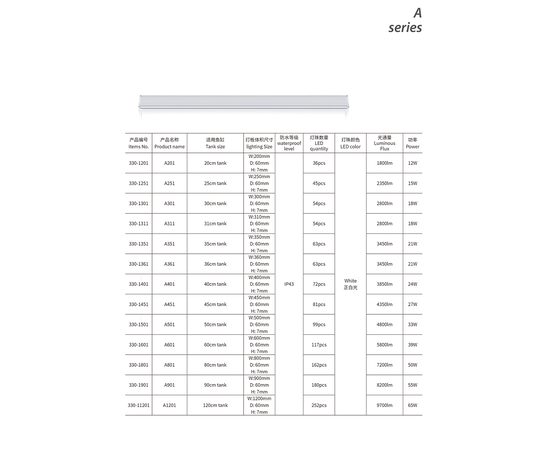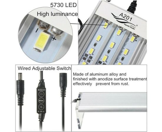 Светильник имеет потребляемую мощность 12 Вт, которую обеспечивают 36 светодиодов по 0,33 Вт каждый. Цветовая температура составляет 8000K, что позволяет создать окраску для рыб, растений и креветок, близкую к натуральной. Световой поток составляет 1800 лм, что является достаточным для выращивания прихотливых растений в аквариуме.