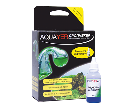 Тесты AQUAYER комплект Дропчекер+Индикатор 30мл. Комплект AQUAYER Дропчекер и Индикатор СО2 - устройство постоянного контроля за концентрацией углекислого газа (СО2) в аквариумной воде и индикаторная жидкость к нему. Удобное решение для аквариумов с растениями.