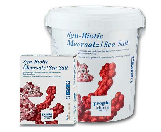 Новая морская соль Tropic Marin Syn-Biotic содержит пробиотические бактерии для рыб и креветок, а также специальный пребиотический корм, способствующий размножению пробиотических бактерий и созданию среды с низким содержанием питательных веществ в аквариумах, заселенных крупнополипными (LPS) и мелкополипными (SPS) жесткими кораллами. Термин synbiotic (синбиотик) относится к пищевым добавкам, содержащим синергетическую комбинацию про- и пребиотиков.